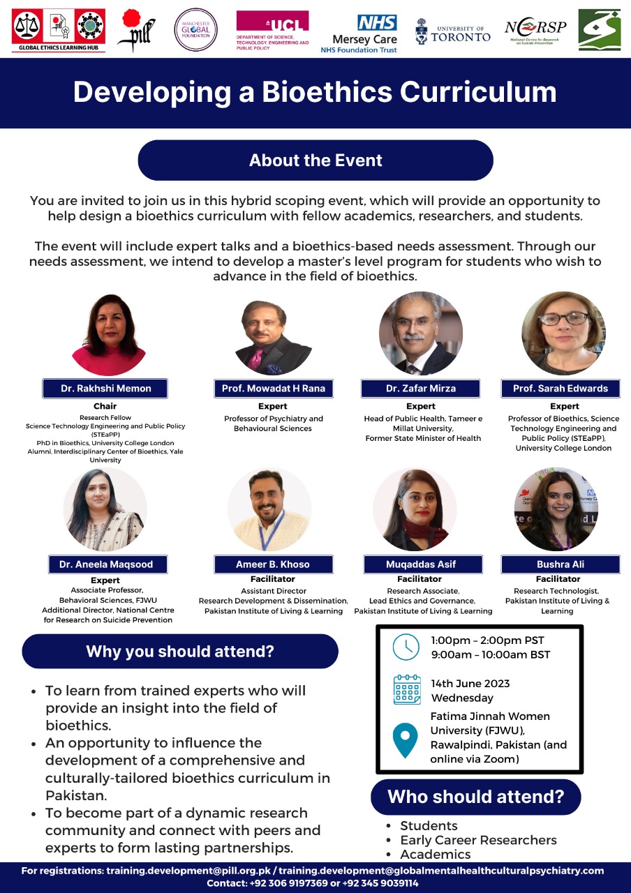 You are invited to join a hybrid scoping event focused on Developing a Bioethics Curriculum. This event provides a vital opportunity to help design a bioethics curriculum with fellow academics, researchers, and students, specifically aiming to develop a Master’s level program for students interested in the field. The event will feature expert talks and a bioethics-based needs assessment. The distinguished lineup of experts includes the Chair, Dr. Rakhshi Memon (Research Fellow, STEAPP, UCL), and Experts Prof. Mowadat H Rana, Dr. Zafar Mirza, Prof. Sarah Edwards (UCL), and Dr. Aneela Maqsood (FJMU), alongside facilitators from the Pakistan Institute of Living & Learning. Attendees should participate to learn from trained experts, influence the development of a comprehensive and culturally-tailored bioethics curriculum in Pakistan, and become part of a dynamic research community. The event is scheduled for Wednesday, 14th June 2023, running from 1:00pm – 2:00pm PST (9:00am – 10:00am BST). It will be held at Fatima Jinnah Women University (FJMU), Rawalpindi, Pakistan, with an option to join online via Zoom. The target audience includes Students, Early Career Researchers, and Academics. For registrations, interested individuals can contact training.development@pill.org.pk or training.development@globalmentalhealthpsychiatry.com, or call +92 306 9197369 or +92 345 9059814.